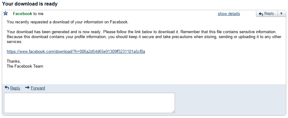 8. That's it. Click on the given link and enter your password to confirm your identity and save the file on your hard disc. You can share this file or even upload onto other services or just keep it in your hard disc as a back up of your Facebook Profile.